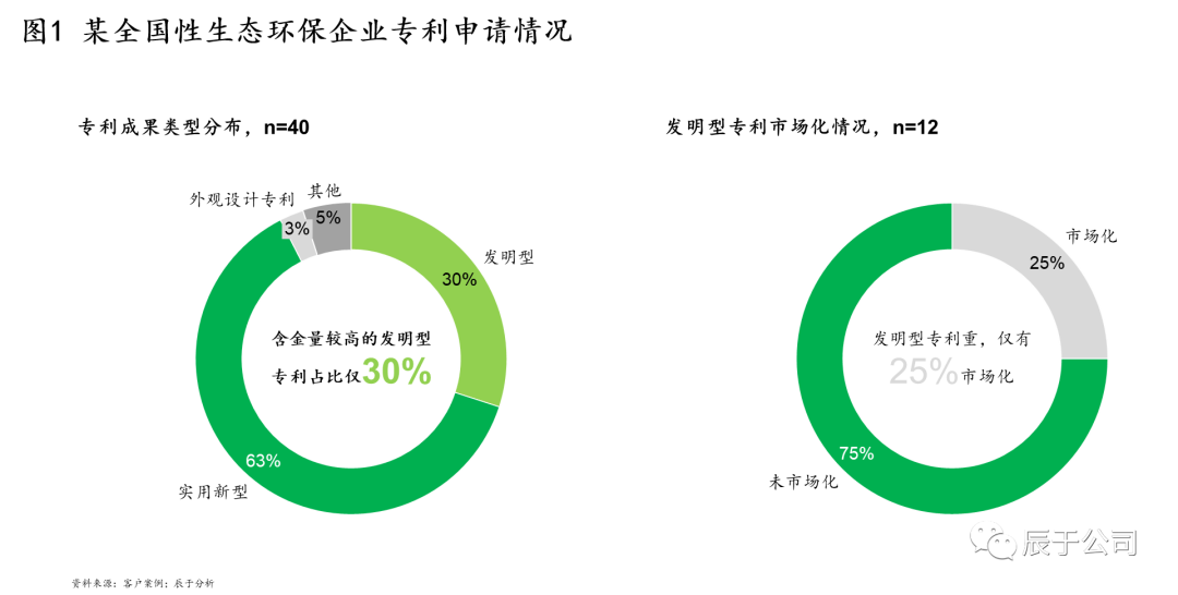 以我們服務(wù)過的某全國性生態(tài)環(huán)保企業(yè)為例,盡管營業(yè)收入已近70億元,但當(dāng)年的研發(fā)投入不足1000萬元,專利申請數(shù)區(qū)區(qū)40件,且63%的為實用新型專利,含金量較高的發(fā)明型專利僅占30%,其中又只有25%的進行了商業(yè)應(yīng)用(見圖1)。