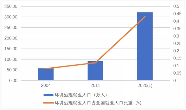 圖2  環(huán)境治理就業(yè)人口及占全國就業(yè)人口比重