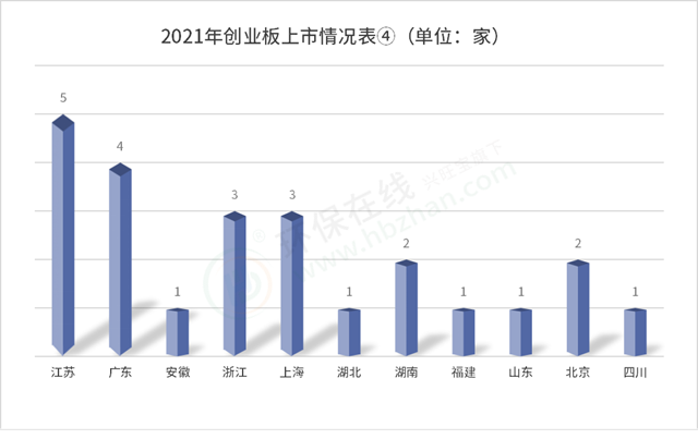 上述數(shù)據(jù)顯示,2021年,登陸創(chuàng)業(yè)板的環(huán)保企業(yè)以江蘇最多,廣東次之,浙江和上海均有三家,整體覆蓋11個省市。除了江浙、北上廣以及福建這些市場“寵兒”,“兩湖”加皖魯川也各有斬獲,總體來看南方市場比較受歡迎。