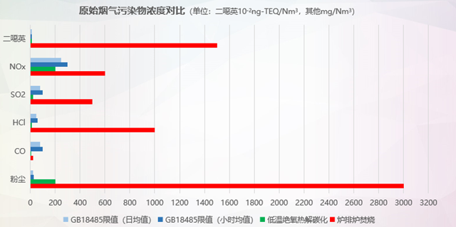 羅宇煊用云南水務(wù)在昆明周邊的兩個(gè)200噸級(jí)的垃圾處理廠的真實(shí)數(shù)據(jù),對(duì)低溫絕氧熱解碳化技術(shù)和爐排焚燒技術(shù)的主體布局、爐腔溫度、廠區(qū)工藝、煙氣處理和原始煙氣污染物濃度作了進(jìn)一步的對(duì)比。