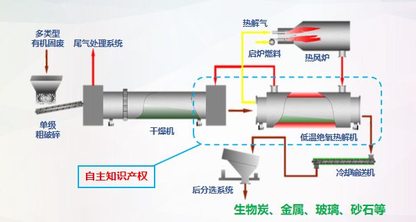 低溫絕氧熱解碳化技術(shù)是個(gè)負(fù)碳過(guò)程,也是碳中和、碳達(dá)峰的重要手段之一。其具有兩大特點(diǎn):一是,技術(shù)包容性強(qiáng),污泥、餐廚垃圾等多種類(lèi)有機(jī)固廢協(xié)同處理;二是,100%資源化,熱解氣回歸系統(tǒng)再利用,終產(chǎn)物只有生物炭、金屬、玻璃、砂石。