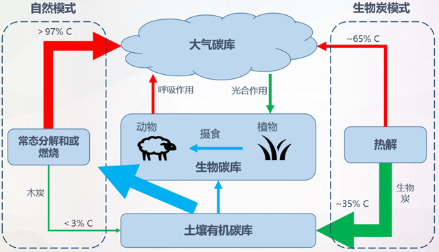 工業(yè)化時(shí)代之前,碳排放是一個(gè)完全自然平衡的狀態(tài);但工業(yè)化之后,人類(lèi)大量從土壤中獲取化石能源進(jìn)行碳排放,徹底打破了這個(gè)平衡。自然環(huán)境下幾百年、上千年才能留下的沉積碳,現(xiàn)在通過(guò)生物炭模式就能在短短一兩個(gè)小時(shí)在工業(yè)環(huán)節(jié)中就能把原生垃圾和其他有機(jī)固廢處理成生物碳并還碳入土,其各環(huán)節(jié)的碳比例如下圖所示: