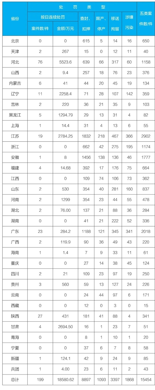 2021年1-12月,全國(guó)五類案件總數(shù)為15454件。其中,按日連續(xù)處罰案件數(shù)量為199件,罰款金額為18580.62萬元;適用查封、扣押案件數(shù)量為8897件;適用限產(chǎn)、停產(chǎn)案件數(shù)量為1093件;移送拘留案件數(shù)量為3397件;移送涉嫌環(huán)境污染犯罪案件數(shù)量為1868件。