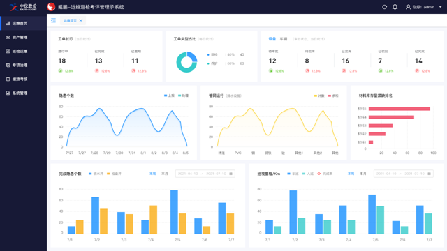 系統(tǒng)首頁(yè):數(shù)據(jù)可視化匯總平臺(tái),快速準(zhǔn)確查看項(xiàng)目中的各信息模塊部分。同時(shí),各種形式的統(tǒng)計(jì)圖表直觀反映管網(wǎng)的真實(shí)信息。