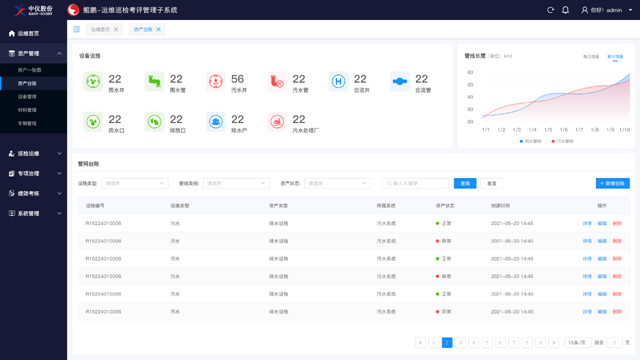我們借助《鯤鵬-管網(wǎng)運(yùn)維巡檢考評(píng)管理子系統(tǒng)》,運(yùn)用現(xiàn)代化的手段,做到管網(wǎng)數(shù)據(jù)的賬冊(cè)化管理、巡視任務(wù)周期性分配、巡視成果及時(shí)上報(bào)、巡視團(tuán)隊(duì)科學(xué)管理、運(yùn)維成果績(jī)效考核。以日常巡檢養(yǎng)護(hù)為核心,以提質(zhì)增效為戰(zhàn)略目標(biāo),實(shí)現(xiàn)排水運(yùn)維工作的數(shù)字化、信息化、全面化、實(shí)時(shí)化,保障排水系統(tǒng)高質(zhì)量發(fā)展,構(gòu)建運(yùn)維建設(shè)新體系,引領(lǐng)高效運(yùn)維管理新時(shí)代。
