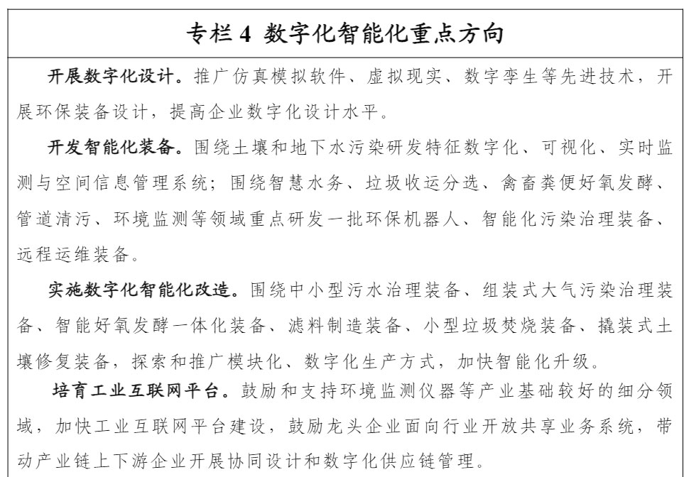 《行動計劃》規(guī)定,要深入推進5G、工業(yè)互聯(lián)網、大數(shù)據(jù)、人工智能等新一代信息技術在環(huán)保裝備設計制造、污染治理和環(huán)境監(jiān)測等過程中的應用。環(huán)保行業(yè)的數(shù)字化,近年來也是一個熱點話題,未來值得企業(yè)更加關注。