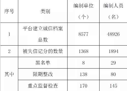 表1 信用平臺(tái)建立誠(chéng)信檔案及失信記分的編制單位及個(gè)人數(shù)量表