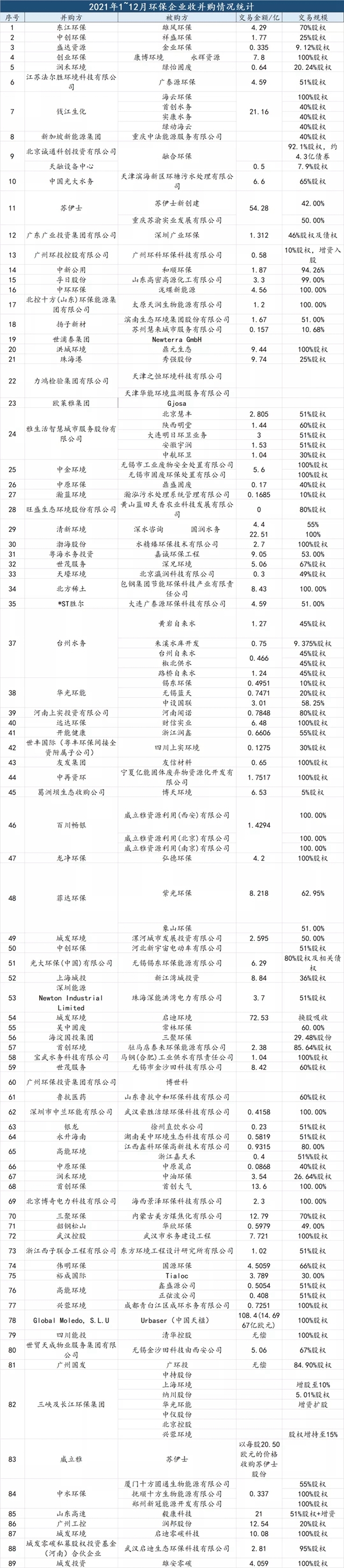 據(jù)中國固廢網(wǎng)不完全統(tǒng)計,2021年環(huán)保產(chǎn)業(yè)收并購案達120起,涉及金額超500億元,其中規(guī)模最大收并購案為兩大國際企業(yè)的合體——威立雅收購蘇伊士。早在2020年10月,威立雅稱已經(jīng)以每股18歐元(包含股息)的價格收購蘇伊士公司29.9%的股份;2021年1月,威立雅擬收購蘇伊士剩余70.1%股權;2021年5月,威立雅同意以每股20.50歐元的價格收購蘇伊士股份;2021年12月,威立雅和蘇伊士對歐盟反壟斷監(jiān)管機構提交收購相關承諾,若收購事宜進展順利,環(huán)保產(chǎn)業(yè)將迎來規(guī)模最大并購案;而城發(fā)環(huán)境收購啟迪環(huán)境案、中國天楹出售Urbaser案,多樁環(huán)保收購案又將折射出行業(yè)怎樣的動態(tài),管中窺豹,未來一年環(huán)保產(chǎn)業(yè)又將在收并購案影響下有何新趨勢?