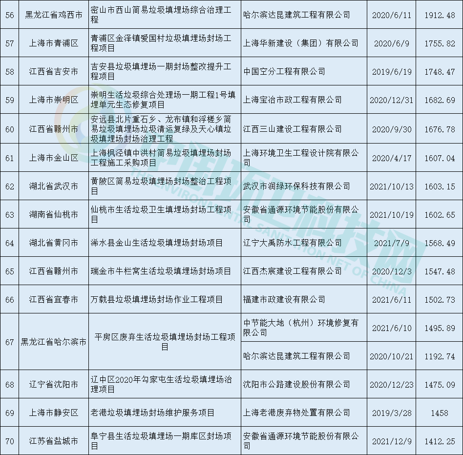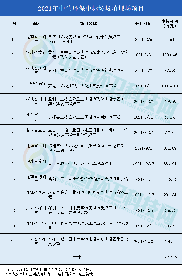 據環(huán)衛(wèi)科技網統(tǒng)計,2021年,中蘭環(huán)保累計中標了14個垃圾填埋場項目,合計金額達4.73億元。其中上千萬級項目有6個,包括2個億元級項目——余姚市原應急生活垃圾填埋場環(huán)境綜合整治項目和蕪湖市垃圾處理廠飛灰處置及封場工程。項目匯總表如下圖。