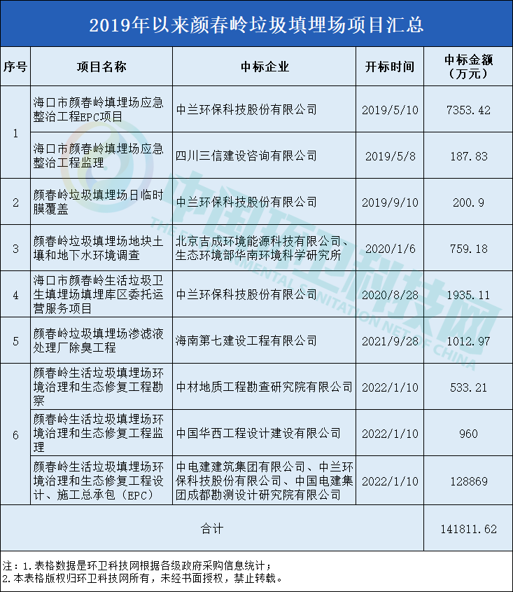 據環(huán)衛(wèi)科技網統(tǒng)計,2019年以來,顏春嶺垃圾填埋場就有6個環(huán)境治理相關項目開標,包括日臨時膜覆蓋、地塊土壤和地下水環(huán)境調查、填埋庫區(qū)委托運營服務、滲濾液處理廠除臭工程以及環(huán)境治理和生態(tài)修復工程,合計投入達到14.18億元。總投資近13億元的顏春嶺生活垃圾填埋場環(huán)境治理和生態(tài)修復工程更是迄今為止國內金額最高的項目!