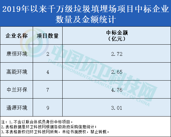 整體來看,參與競爭企業(yè)數(shù)量眾多、市場集中度不高。在諸多環(huán)保企業(yè)中,中蘭環(huán)保、通源環(huán)境、康恒環(huán)境和高能環(huán)境拿下較多的垃圾填埋場封場和生態(tài)修復項目,其中中蘭環(huán)保以4.76億元的中標額位居第一位。