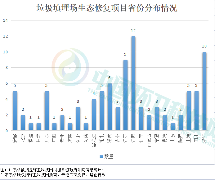 從省份分布來看,江西省開標項目數(shù)量最多,共12個垃圾填埋場生態(tài)修復工程,遠超其他省份。2020年以來,江西省生活垃圾分類工作堅持立法引領,以國家試點帶動其他地區(qū)的垃圾分類工作,堅持抓好垃圾分類設施建設,到2020年底,該省11個設區(qū)市全部建成生活垃圾焚燒廠;除已完成南昌、宜春市生活垃圾分類國家試點任務外,其余設區(qū)市和53個省生態(tài)文明示范縣(市、區(qū))已全部啟動垃圾分類工作,城區(qū)原生生活垃圾處理基本實現(xiàn)“零填埋”;2021年,該省新增生活垃圾焚燒日處理能力5000噸、廚余垃圾日處理能力500噸,年底城鎮(zhèn)原生生活垃圾基本實現(xiàn)“零填埋”。