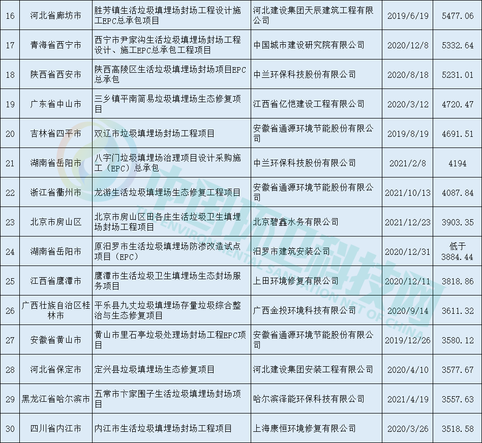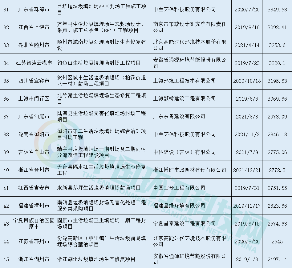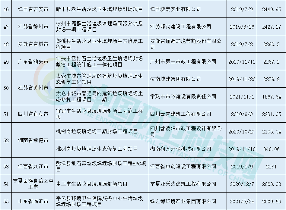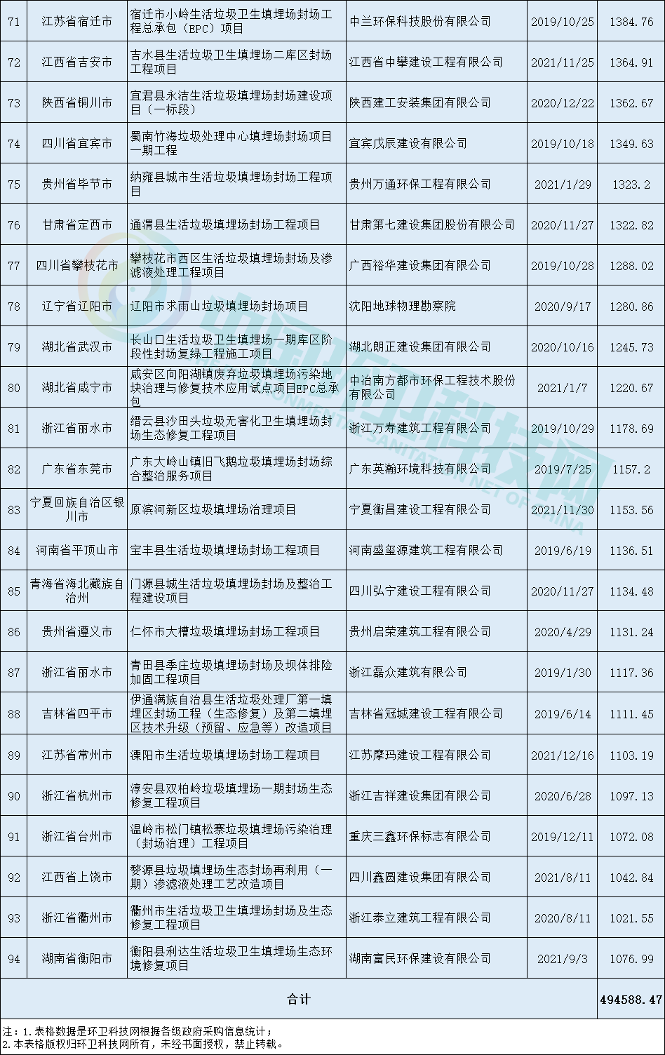 據環(huán)衛(wèi)科技網統(tǒng)計,2019年以來,全國共開標94個千萬級垃圾填埋場封場和生態(tài)修復工程項目,合計中標金額超過49億元,其中億元級以上項目有9個。(具體統(tǒng)計表見文末)