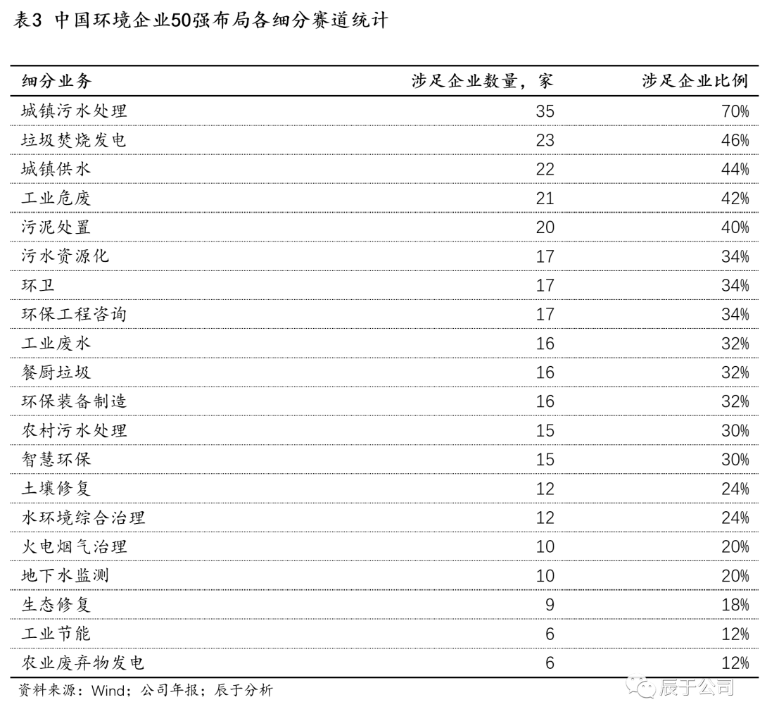 更細分去看,城鎮(zhèn)污水處理、垃圾焚燒發(fā)電、城鎮(zhèn)供水、工業(yè)危廢等是中國環(huán)境企業(yè)50強布局最多的細分領域(見表3),這些領域基本都是規(guī)模上千億甚至數千億的市場,“盤子”足夠大,商業(yè)模式穩(wěn)定,是環(huán)境強企必爭之地。