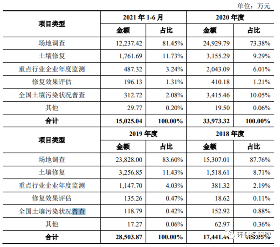 “報(bào)告期各期(2018-2021H1),公司土壤和地下水檢測(cè)業(yè)務(wù)收入分別為 17,441.44 萬(wàn)元、28,503.87 萬(wàn)元、33,973.32 萬(wàn)元、15,025.04 萬(wàn)元,占公司主營(yíng)業(yè)務(wù)收入的比重分 別為 98.15%、95.69%、94.73%、91.81%?!?/span>