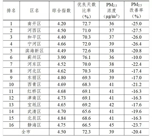 2021年,各區(qū)PM2.5濃度在36~45µg/m3之間,優(yōu)良天數(shù)比率在65.6%~76.1%之間。按照PM2.5濃度、PM2.5改善率和優(yōu)良天數(shù)比率排名位次數(shù)值各占30%、30%和40%的權(quán)重進(jìn)行排名,全年排名較好的區(qū)為南開區(qū)、河西區(qū)和和平區(qū),較差的區(qū)為靜海區(qū)、北辰區(qū)和武清區(qū)。