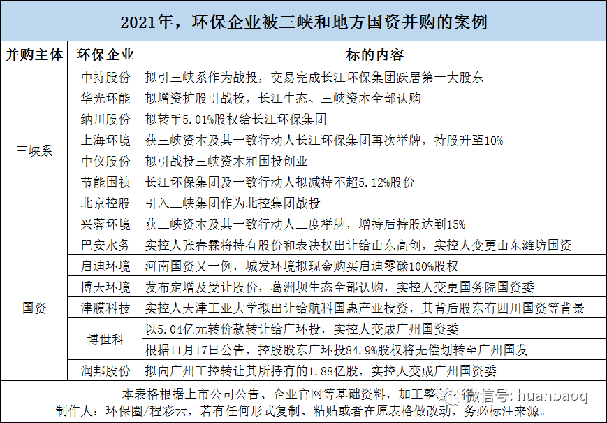 深:影響之深為近年來之最,去年發(fā)生的88起收并購,從某種意義上講已經(jīng)不是某些企業(yè)的戰(zhàn)略進與退,也不是傳統(tǒng)行業(yè)跨界環(huán)保這樣簡單,它背后傳遞的信號有央企、國資、民企、外企四股力量的競爭更迭,也有行業(yè)最徹底洗牌、低負債對高負債的清算等,意味深遠。并購頻率之多、交易金額之大,波及范圍之廣,產(chǎn)業(yè)影響之深,讓2021年環(huán)保產(chǎn)業(yè)收并購更加有看頭。在這一年里,我們不僅見證了世界級環(huán)保巨頭“老大并購老二”的一波三折,也領略了三峽、地方國資進擊環(huán)保行業(yè)的“兇猛”,還看到了部分民企賣資產(chǎn),國資接盤“混改”大潮的落幕。從2020年8月,威立雅首次提出要收購蘇伊士股份起,直到2021年12月14日,歐盟委員會正式批準二者收購交易,這場歷時1年零三個月,震驚環(huán)保圈的收購大案也進入收尾階段。最終的收購價,威立雅同意以每股20.50歐元的價格收購蘇伊士股份,要比最初的每股15歐元的報價加價不少。(詳情查閱:威立雅蘇伊士簽署合并協(xié)議,“洋水務”劍指中國市場?)去年6月,中國天楹宣布要15億歐元(折合人民幣約115億元)出售Urbaser 100%股權,9月底就走完了各項流程,10月中下旬就披露完成了所有交割事項,速度非???,絲毫不拖泥帶水。對于這場收購案,媒體評價大都是正面,甚至有的還說中國天楹“里外躺贏”,在持有Urbaser的這些年中,中國天楹不僅在技術提升、產(chǎn)業(yè)鏈布局、海外業(yè)務、品牌影響力等方面獲益匪淺,而且通過買賣騰挪,中間除了掙了3.5億歐元投資差價之外,還把公司資產(chǎn)負債率,商譽減值風險都降低了,簡直是人生贏家。(詳情查閱:中國天楹擬15億歐元出售Urbaser,賠了or賺了?)“一波三折”的城發(fā)環(huán)境換股吸收合并啟迪環(huán)境案,從去年年初一直持續(xù)到8月,才經(jīng)過河南省財政廳及河南省國資委正式批復,中間較為突破的是6月份,城發(fā)環(huán)境宣布擬12.8億元并購啟迪環(huán)境相關資產(chǎn),其中擬定10億元收購鄭州啟迪零碳100%股權,2.81億元收購武漢啟迪生態(tài)所持的5家下屬公司95%股權。帶著政治任務而來的三峽集團,近兩年不斷擴大自己“朋友圈”,一旦被其看上,輕則舉牌增持股份,比如興蓉環(huán)境、上海環(huán)境就多次獲其增持;重則引入戰(zhàn)投,躍居大股東,比如中持,享受項目、訂單上的傾斜。據(jù)筆者不完全統(tǒng)計,2021年,三峽系通過三峽資本以及一致行動人長江生態(tài)環(huán)保集團,引戰(zhàn)投、舉牌增持上市環(huán)企高達8家,其中不僅有北控水務、上海環(huán)境、中持股份、興蓉環(huán)境等水務龍頭,還有華光環(huán)能、納川股份、中儀股份等細分領域的“強兵悍將”。最后的這個,不是某一家環(huán)保企業(yè),而是一類環(huán)保企業(yè)。從2018年起,環(huán)保行業(yè)的“混改潮”已經(jīng)持續(xù)了好幾年。本以為這場上市民企易主、國資混改的悲情大戲就要完結(jié)了,誰知去年還是斷斷續(xù)續(xù)有地方國資接盤上市民企案發(fā)生,兜兜轉(zhuǎn)轉(zhuǎn),博世科、巴安水務、博天環(huán)境、潤邦股份、啟迪環(huán)境終于在去年成功聯(lián)姻國資,抱上了金主大腿。▼圖五:三峽系和地方國資增持并購環(huán)保案例