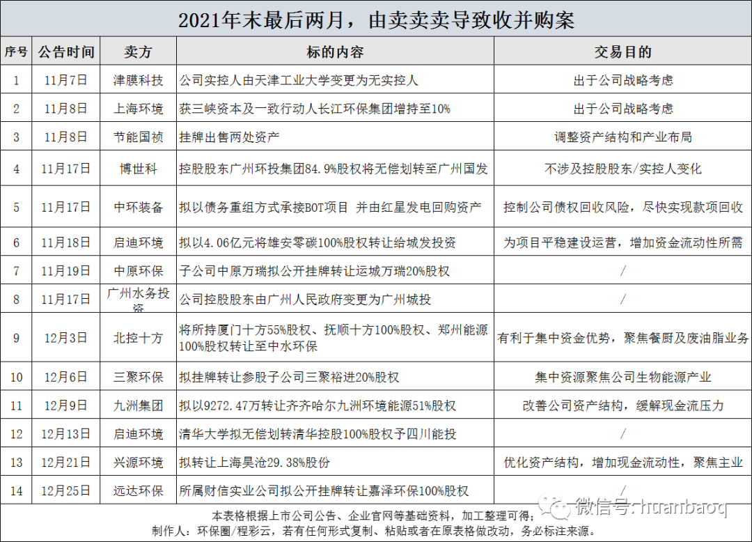 其中的緣由、波折、心酸,恐怕只有當事人心里最清楚。“引入戰(zhàn)略投資者是一個雙向選擇的過程,就像處對象,不能看見別人都結(jié)婚了就慌了,還是要理性抉擇對的人。作為公眾公司,重要的是在承受壓力的過程中保持定力,從容面對選擇?!?/span>博天環(huán)境董事長趙笠鈞的一段話頗可以代表環(huán)保民企的心聲。其實,央企、地方國資大舉進入環(huán)保、上市民企找“金主”輸血紓困,表面是一場買與賣的商業(yè)游戲,實則加速了高負債和問題環(huán)保企業(yè)的出清,而今后迎來環(huán)保產(chǎn)業(yè)發(fā)展的新階段奠定了基礎。正如上文所說,這是行業(yè)最徹底的一次洗牌!也是低負債對高負債的清算,同時還是“央企國資主導、民企專注技術配套”產(chǎn)業(yè)新格局塑造的過程。縱觀每年業(yè)內(nèi)發(fā)生的收并購交易,大的也好,小的也罷,好比一面鏡子,能夠從中洞察公司戰(zhàn)略的進與退,窺探環(huán)保產(chǎn)業(yè)競爭格局的變遷、細分賽道的冷與熱。七年前,2015年,“水十條”戰(zhàn)役打響,PPP風頭強勁,圍繞黑臭水體、流域綜合治理大項目層出不窮,中字頭大央企、傳統(tǒng)行業(yè)企業(yè)紛紛跨界并購“買買買”,業(yè)內(nèi)驚呼“野蠻人來了”。五年前,2017年,受益于清廢行動、無廢城市、垃圾分類等政策的推動,固廢行業(yè)各個細分賽道——危廢、環(huán)衛(wèi)、有機垃圾等景氣度不斷高漲,各個子領域收并購交易頻繁發(fā)生,以2017年-2018年的危廢行業(yè)最為突出,兩年累計發(fā)生30多起并購案,超過14家行業(yè)外上市公司跨界涌入危廢行業(yè)。三年前,2019年,環(huán)保行業(yè)收并購開始細微變化,出現(xiàn)分化情形。1、由之前的“買買買”到如今的“賣賣賣”,主動收縮業(yè)務如今的環(huán)保行業(yè),幾乎都是在“賣賣賣”,稍微大點的賣股權,小點的賣項目,主動收縮業(yè)務戰(zhàn)線。這里想強調(diào)一點,不得已“賣賣賣”的,不僅是業(yè)內(nèi)熟知的資金出現(xiàn)問題的環(huán)保民企,還有一批之前跨界進軍環(huán)保的傳統(tǒng)行業(yè)企業(yè),比如去年并購案的馬鞍山鋼鐵股份,子公司合肥板材就向?qū)毼渌畡辙D(zhuǎn)讓了合肥供水100%股權,他們賣資產(chǎn)的目的是為了做強做精鋼鐵主業(yè),有序退出非主業(yè)環(huán)保資產(chǎn)。在動蕩不確定大環(huán)境下,在主賽道上儲備更多的精兵強將,在非優(yōu)勢業(yè)務上快刀斬亂麻,不失為明智之舉。2、跨界并購少了,“出?!碧越鹨采倭?/span>中國天楹出售Urbaser就是典型的例子。過去環(huán)保行業(yè)好的時候,中國企業(yè)紛紛走向海外,尋求國外的技術解決方案。如今國內(nèi)日子難過了,大家也就收縮戰(zhàn)線,海外并購隨之減少。這方面也很好理解,民企倒下騰出來的市場空間需要有人補上,于是央企、地方國資就開始了新一輪競爭,誰勝誰輸還需要繼續(xù)觀察。4、真正的洗牌與清算來了,未來或?qū)⒂瓉硇戮置?/span>縱觀近年來的環(huán)保并購大案,無論是上市民企找“金主”輸血紓困,還是諸如三峽、地方國資頻頻舉牌增持環(huán)保,從商業(yè)邏輯來看,其本質(zhì)都是一樣的,即加速高負債和問題環(huán)企的洗牌與出清,雖然過程很痛苦,但這也是整個行業(yè)內(nèi)我調(diào)整與優(yōu)化的必經(jīng)之路。滄海橫流,方顯英雄本色。只有經(jīng)歷了真正的寒冬,才能考驗英雄的成色!環(huán)保行業(yè)真正的洗牌與清算來了,2021年很焦慮,2021年也很艱難。進入2022年,這種行業(yè)出清或許仍將持續(xù),我們必須學會在逆風中行駛,戰(zhàn)勝寒冬,才能迎接更加燦爛的春天。附:2021年環(huán)保產(chǎn)業(yè)88起并購案全圖