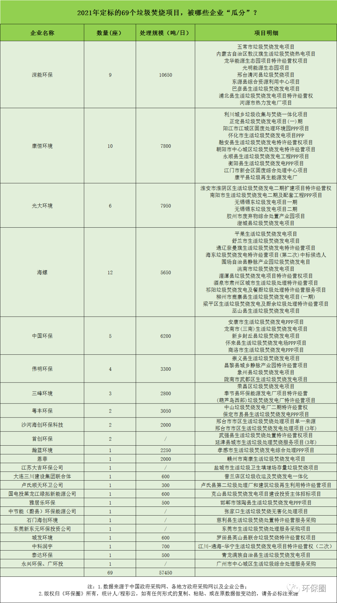 最后,我們從中標企業(yè)的角度,進一步觀察2021年定標的垃圾焚燒項目,被哪些企業(yè)“瓜分”了,這也是每年讀者最感興趣的話題。