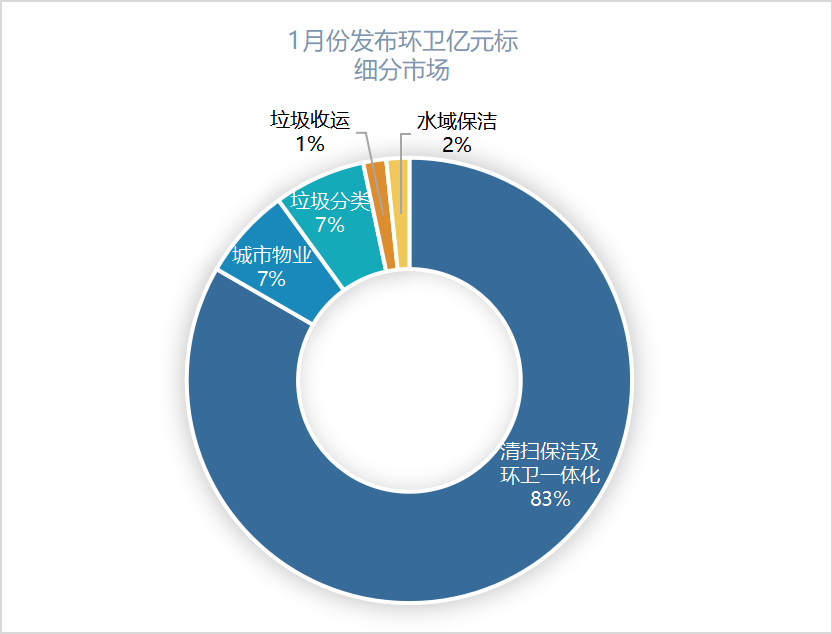 1月份已發(fā)布的60個(gè)環(huán)衛(wèi)億元標(biāo)涉及“清掃保潔及環(huán)衛(wèi)一體化、城市物業(yè)、垃圾分類(lèi)、垃圾收運(yùn)、及水域保潔”等五個(gè)細(xì)分市場(chǎng)。