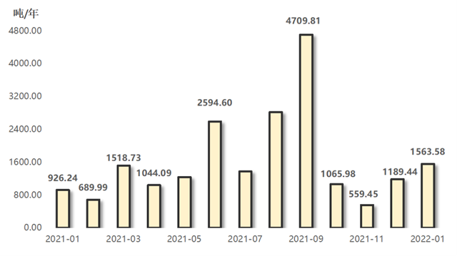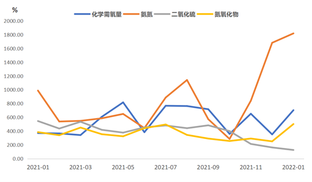 排污權(quán)成交量指標延續(xù)上行走勢。2022年1月,四項排污權(quán)成交量合計為1563.58噸,環(huán)比增長31.46%,與上年同期相比上行68.81%。