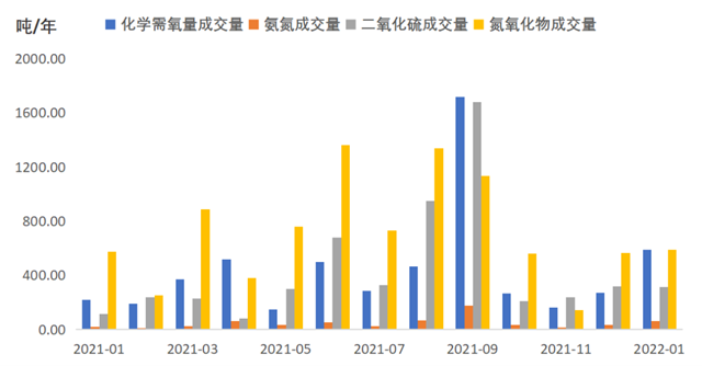 1月點評簡報:浙江省排污權(quán)交易指數(shù)結(jié)束持續(xù)半年震蕩下行走勢,2022年首月指數(shù)顯著回溫,實現(xiàn)“開門紅”。主要污染物中,COD(化學需氧量)、NH3-N(氨氮)和NOx(氮氧化物)交易指數(shù)不同程度上漲,SO2(二氧化硫)交易指數(shù)持續(xù)下行。從成交量和交易活躍度來看,2022年1月排污權(quán)成交量延續(xù)上行走勢,交易活躍度不升反降。其主要污染物中,除SO2(二氧化硫)成交量基本持平以外,其余三項成交量均較上年12月明顯提升。