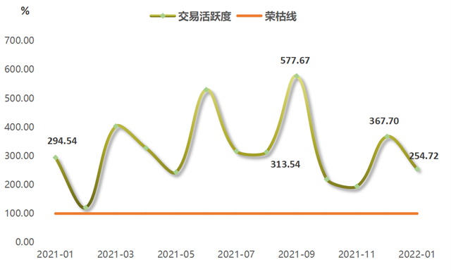浙江省排污權(quán)交易活躍度小幅下滑。由圖可見,交易活躍度指數(shù)在上月翹尾走勢基礎(chǔ)上,小幅回落,2022年1月指數(shù)值收報于254.72點,環(huán)比下行30.73%,與上年同期相比下行13.52%。