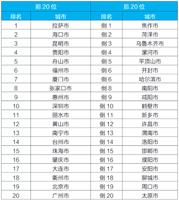 空氣質(zhì)量排名前20位和后20位城市名單
