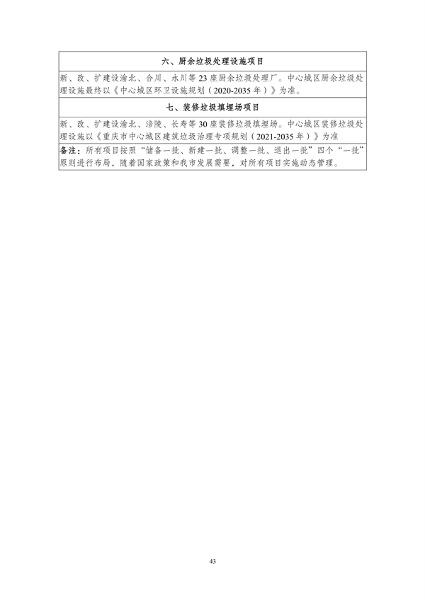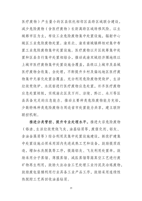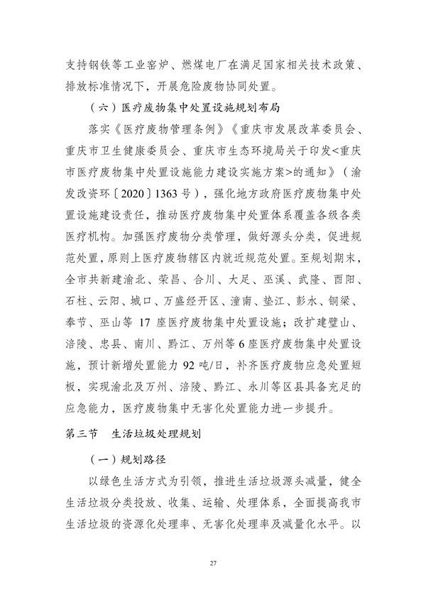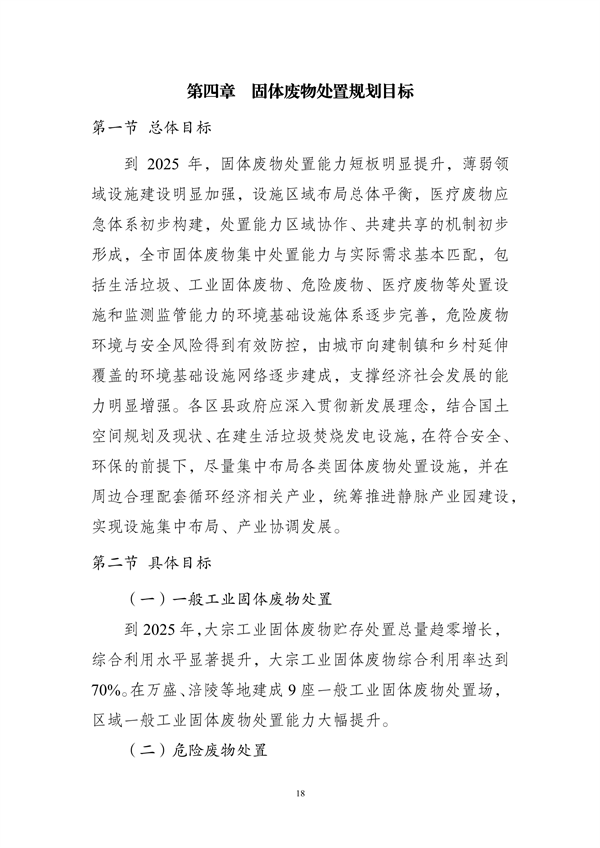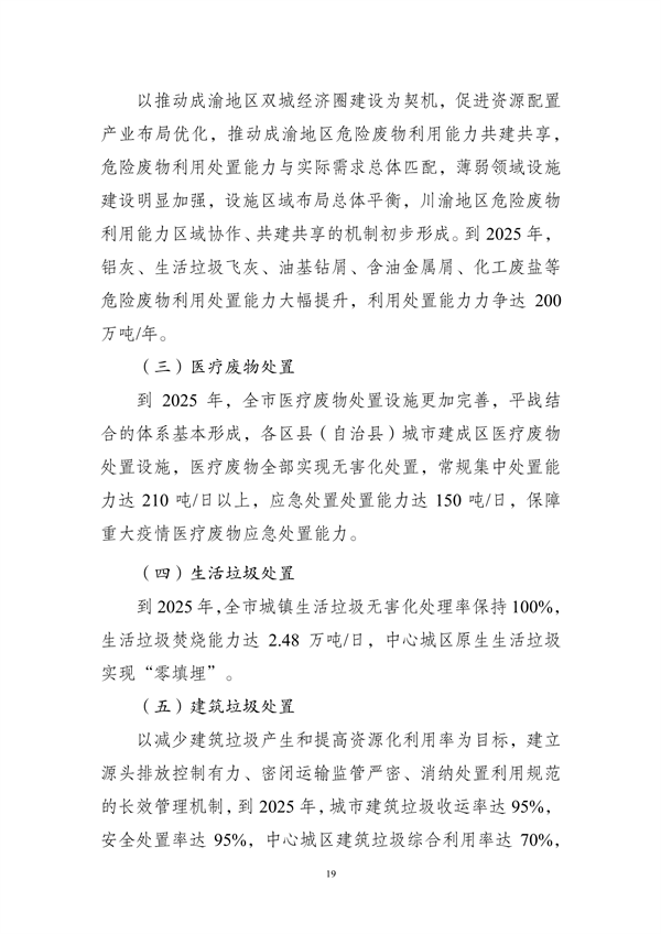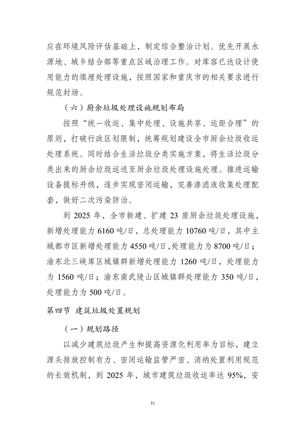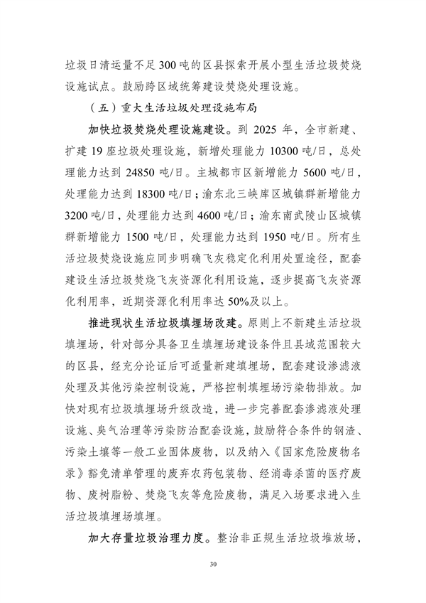 其中提出,到2025年,重慶市中心城區(qū)原生生活垃圾實現(xiàn)“零填埋”,規(guī)劃建設(shè)8個一般工業(yè)固體廢物集中處置設(shè)施建設(shè)項目,9個危險廢物集中處置設(shè)施建設(shè)項目,23個醫(yī)療廢物集中處置項目,新、改、擴建設(shè)合川、銅梁、綦江、奉節(jié)-巫溪、云陽等19座生活垃圾焚燒廠,新、改、擴建設(shè)渝北、合川、永川等23座廚余垃圾處理廠,新、改、擴建設(shè)渝北、涪陵、長壽等30座裝修垃圾填埋場。