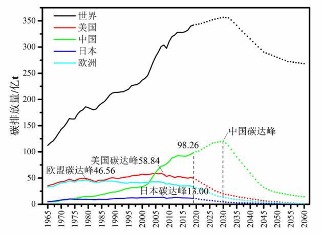 根據(jù)BP數(shù)據(jù),2019年我國(guó)二氧化碳排放量為98.26億噸,占世界的28.8%。從我國(guó)與歐盟、美國(guó)等歷史碳排放量和預(yù)期增長(zhǎng)趨勢(shì)看(圖1),歐盟、美國(guó)、日本在1979年、2007年、2008年已實(shí)現(xiàn)碳達(dá)峰。我國(guó)十八大報(bào)告指出,要大力推進(jìn)生態(tài)文明建設(shè),堅(jiān)持節(jié)約資源和保護(hù)環(huán)境的基本國(guó)策,堅(jiān)持節(jié)約優(yōu)先、保護(hù)優(yōu)先、自然恢復(fù)為主的方針,著力推進(jìn)綠色發(fā)展、循環(huán)發(fā)展、低碳發(fā)展,形成節(jié)約資源和保護(hù)環(huán)境的空間格局、產(chǎn)業(yè)結(jié)構(gòu)、生產(chǎn)方式,從源頭上扭轉(zhuǎn)生態(tài)環(huán)境惡化趨勢(shì),為人民創(chuàng)造良好生產(chǎn)生活環(huán)境,為全球生態(tài)安全作出貢獻(xiàn)。