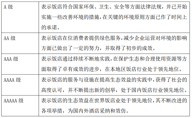 我國于2007年發(fā)布了《綠色飯店等級評定規(guī)定》,根據(jù)企業(yè)在提供綠色服務、保護環(huán)境等方面做出的努力將綠色酒店分為五個等級,具體內(nèi)容如下。