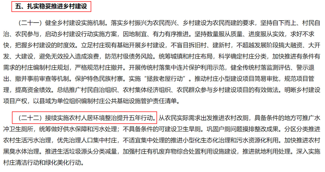 今年的中央一號(hào)文件,已經(jīng)是21世紀(jì)以來(lái)第19個(gè)指導(dǎo)“三農(nóng)”工作的中央一號(hào)文件。中央一號(hào)文件中,對(duì)2022年的“三農(nóng)”工作做出了全面部署,其中包括糧食生產(chǎn)、現(xiàn)代農(nóng)業(yè)、防止規(guī)模性返貧、鄉(xiāng)村產(chǎn)業(yè)、鄉(xiāng)村建設(shè)、鄉(xiāng)村治理、保障機(jī)制,以及黨的領(lǐng)導(dǎo)等8個(gè)章節(jié)。這里面,與環(huán)保產(chǎn)業(yè)關(guān)系最密切的就是第5章“扎實(shí)穩(wěn)妥推進(jìn)鄉(xiāng)村建設(shè)”的第二十二節(jié)“接續(xù)實(shí)施農(nóng)村人居環(huán)境整治提升五年行動(dòng)”。 ·從農(nóng)民實(shí)際需求出發(fā)推進(jìn)農(nóng)村改廁,具備條件的地方可推廣水沖衛(wèi)生廁所,統(tǒng)籌做好供水保障和污水處理;不具備條件的可建設(shè)衛(wèi)生旱廁。
