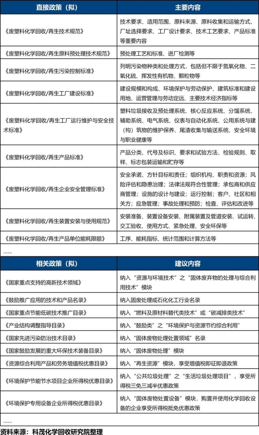 1.建議明確化學回收技術是塑料污染防治體系不可或缺的重要技術,是實現國家“碳達峰碳中和”“兩網融合”“無廢城市”“垃圾分類”“塑料污染治理”的關鍵技術之一。