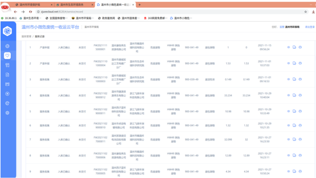 溫州市小微危廢統(tǒng)一收運云平臺截圖