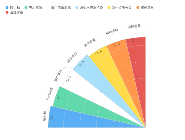 正如中國(guó)青年報(bào)也在兩會(huì)前夕做的調(diào)查結(jié)果一樣:綠色出行(60.1%)、碳中和(55.2%)、節(jié)約資源(54.0%)、推廣清潔能源(53.2%)、減少水資源污染(52.9%)、深化垃圾分類(lèi)(51.6%)、植樹(shù)造林(51.3%)、治理霧霾(51.2%)。