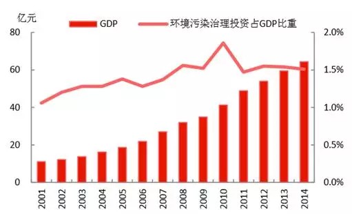 從國(guó)家統(tǒng)計(jì)局的數(shù)據(jù)可以看到,我國(guó)在環(huán)境污染治理方面的投資量,呈現(xiàn)上升趨勢(shì),2014年達(dá)到9576億元;近年占GPD的比重維持在1.5%左右,較2001年提升約0.5個(gè)百分點(diǎn)。發(fā)改委、環(huán)保部印發(fā)《關(guān)于培育環(huán)境治理和生態(tài)保護(hù)市場(chǎng)主體的意見(jiàn)》,提出目標(biāo),“十三五”綠色環(huán)保產(chǎn)業(yè)產(chǎn)值年均增長(zhǎng)15%以上,遠(yuǎn)高于CDP的增長(zhǎng)目標(biāo),為經(jīng)濟(jì)增長(zhǎng)注入動(dòng)力。