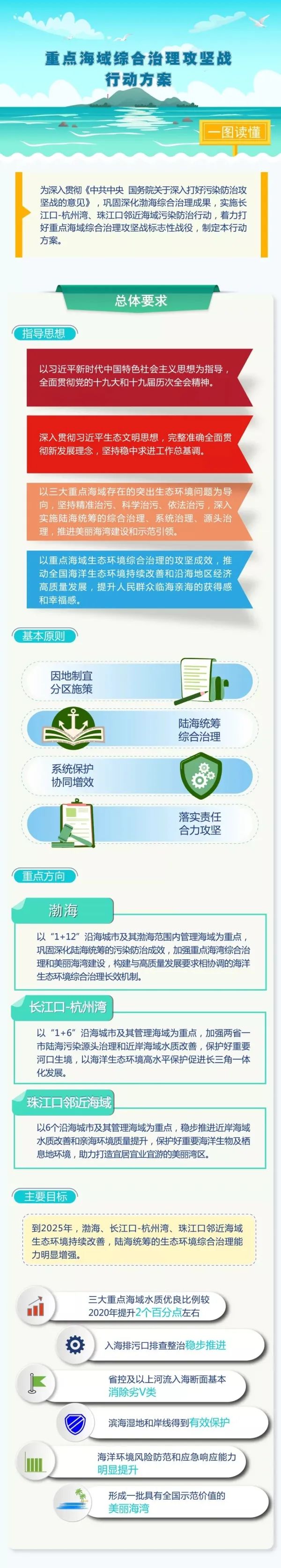 《行動(dòng)方案》提出,按照因地制宜、分區(qū)施策,陸海統(tǒng)籌、綜合治理,系統(tǒng)保護(hù)、協(xié)同增效,落實(shí)責(zé)任、合力攻堅(jiān)的基本原則,深入打好重點(diǎn)海域綜合治理攻堅(jiān)戰(zhàn),實(shí)現(xiàn)“十四五”時(shí)期三大重點(diǎn)海域生態(tài)環(huán)境持續(xù)改善、陸海統(tǒng)籌的生態(tài)環(huán)境綜合治理能力明顯增強(qiáng)、人民群眾臨海親海的獲得感和幸福感不斷提升。