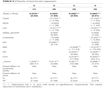 基準(zhǔn)回歸結(jié)果如下表所示,由回歸結(jié)果可知,無論是否加入控制變量,核心解釋變量的系數(shù)均顯著為正,表明綠色金融試點(diǎn)政策顯著提升了試點(diǎn)地區(qū)綠色企業(yè)的長期價(jià)值。