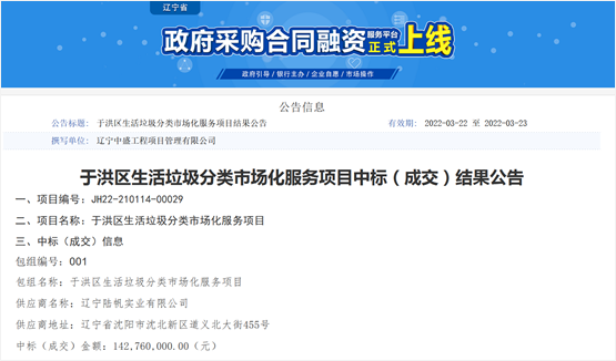 遼寧省政府采購(gòu)網(wǎng)消息,2022年3月22日,沈陽(yáng)市于洪區(qū)生活垃圾分類(lèi)市場(chǎng)化服務(wù)項(xiàng)目公布開(kāi)標(biāo)結(jié)果,成交價(jià)1.4276億元。