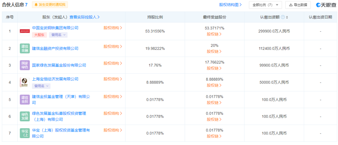 3月,寶武綠碳私募投資基金(上海)合伙企業(yè)(有限合伙)成立,執(zhí)行事務(wù)合伙人為建信金投基金管理(天津)有限公司、華寶(上海)股權(quán)投資基金管理有限公司,經(jīng)營范圍為以私募基金從事股權(quán)投資、投資管理、資產(chǎn)管理等活動(dòng)。