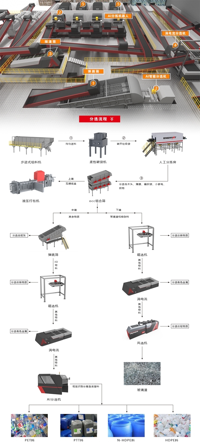 一圖向你闡述高科技的魅力,源頭分類精準(zhǔn)度不高、先分后混、人工分揀難度大、成本高、配套基建水平落后,恩派特為這些問題找到了一條千河入海的同一路徑——由步進(jìn)式給料機(jī)、柔性破袋機(jī)、OCC組合篩、AI智能分選機(jī)、彈跳篩、渦電流分選機(jī)、磁選機(jī)、風(fēng)選機(jī)、2D/3D分選機(jī)、AI分揀機(jī)器人等強(qiáng)強(qiáng)組合的高智能化自動分揀流水線。