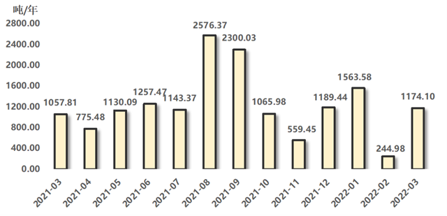 排污權(quán)成交量指標(biāo)止跌回升,四項(xiàng)污染物指標(biāo)同步上行。2022年3月,四項(xiàng)排污權(quán)成交量合計(jì)為1174.10噸,環(huán)比增長(zhǎng)379.27%,與上年同期相比增長(zhǎng)10.99%。
