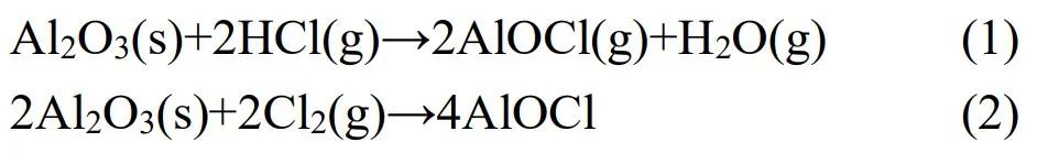 經(jīng)純水和鹽酸浸出后,飛灰中KCl和NaCl的衍射峰基本消失,表明可溶性氯鹽被脫除。飛灰經(jīng)純水浸出,出現(xiàn)明顯的水溶性較低的Ca(OH)2(ICDD 01-078-0315)衍射峰,可能是CaO等堿性氧化物與水反應所致。鹽酸浸出后飛灰中的主要礦物相為CaCO3、SiO2(ICDD 01-075-0443)和AlOCl。大量溶解性鹽類被脫除后,性質(zhì)穩(wěn)定的SiO2衍射峰更明顯。同時,原灰中AlOCl物相的衍射特征峰明顯增強,結(jié)果表明原灰中包含不可溶氯鹽,可能是飛灰在高溫焚燒過程中產(chǎn)生的,見式(1)、(2)。