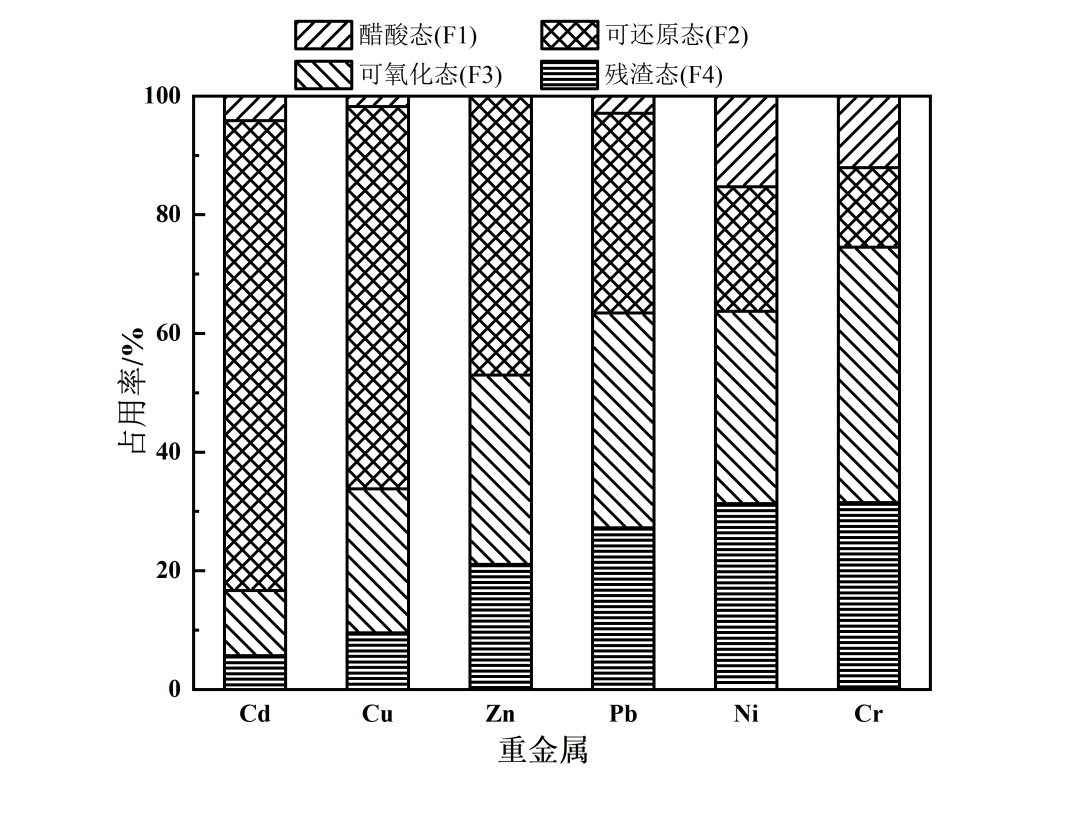 重金屬的生物有效性及潛在遷移性不僅與其總量有關(guān),還與其在飛灰中的賦存形態(tài)密切相關(guān),按照BCR分級提取法對焚燒飛灰中不同形態(tài)重金屬進行提取測定。BCR四步連續(xù)提取法將重金屬分為F1態(tài),主要含有水溶態(tài)、可交換態(tài)和碳酸鹽結(jié)合態(tài),在中性或弱酸性條件下易浸出;F2態(tài)主要是鐵錳氧化物結(jié)合態(tài),高活性的鐵錳氧化物比表面積大,對金屬離子有較大吸附容量,在還原條件下較易釋放;F3態(tài)包括有機物與硫化物結(jié)合態(tài),這一過程提取出來的重金屬,是被有機物或硫化物絡合的部分,在強氧化條件下可分解;F4態(tài)中元素主要與硅酸鹽礦物組合,在自然條件下性能穩(wěn)定,環(huán)境生態(tài)風險較小。本研究飛灰中重金屬的不同賦存形態(tài)所占百分比如圖1所示。
