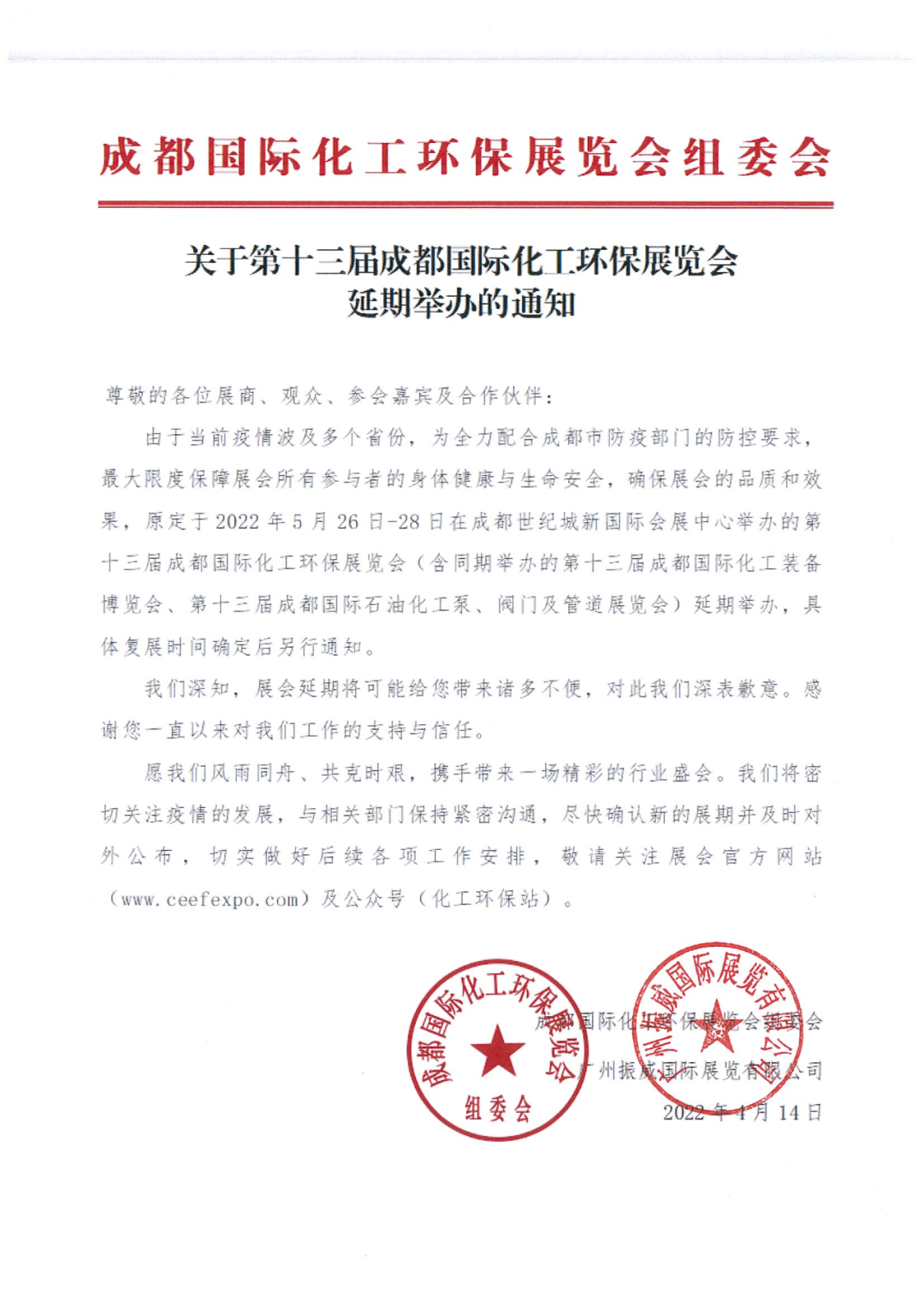 關(guān)于第十三屆成都國際化工環(huán)保展覽會(huì) 延期舉辦的通知