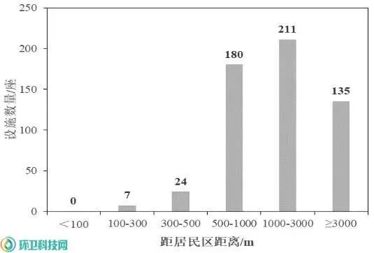 GB16889-2008規(guī)定:生活垃圾填埋場場址的位置及與周圍人群的距離應(yīng)依據(jù)環(huán)境影響評價結(jié)論確定,并經(jīng)地方環(huán)境保護行政主管部門批準(zhǔn)。由圖3可知,2010~2015年新建填埋場中,填埋場場址距周邊居民區(qū)小于300米的有7座,300~500米的有24座,二者占有效數(shù)據(jù)(557座)的5.6%;500~1000米的有180座,占有效數(shù)據(jù)的32.5%;而距離大于3000米以上的填埋場僅135座,占有效數(shù)據(jù)的24.2%?,F(xiàn)場調(diào)研情況和統(tǒng)計分析結(jié)果表明:距居民區(qū)1000米內(nèi)填埋場的惡臭投訴事件近90%,而距居民區(qū)大于3000米填埋場的惡臭投訴事件則幾乎沒有。