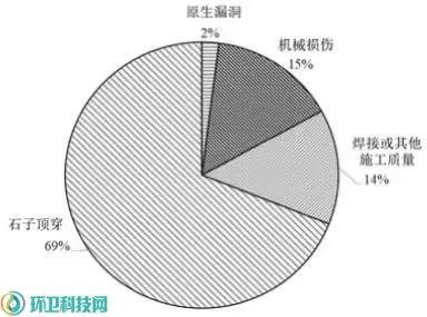 防滲層破損原因大致分為原生漏洞和次生漏洞兩種類型,其中次生漏洞又包括石子或樹根頂穿、機械損傷以及焊接問題三種類型。通過對漏洞檢測數(shù)據(jù)的統(tǒng)計分析,得出上述不同原因造成的HDPE膜破損的比例如圖4所示。