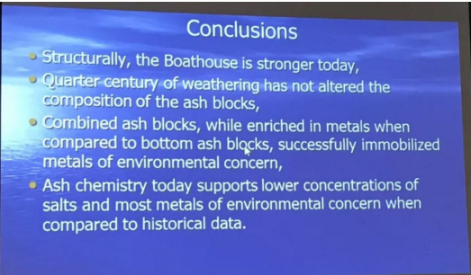 這位教授的演講題目很有趣,叫“船屋”。他講述了自己在年輕時候從垃圾焚燒廠弄回來一些垃圾灰制成的磚,用這些磚制作了一個小房間,這個小房間是用于存放他出去游玩的一艘小船的。為了檢驗這些垃圾灰是否對人存在傷害,在這個幾十年中間,這位老教授會定期從墻上取樣分析這些灰的成分變化,并將這些數(shù)據(jù)展現(xiàn)在我們面前。
