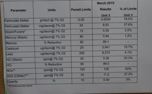 會議之后,我們開始陸續(xù)走訪工廠,第一個是美國明尼阿波利斯—Olmsted焚燒廠,該廠為2x100t/d+1x200t/d的規(guī)模,煙氣工藝采用的是固定噴霧法+布袋除塵器。全廠排放情況尚可,具體如下: