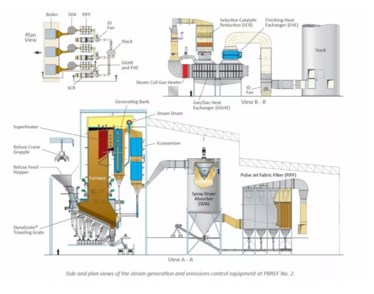接下來說重點(diǎn),介紹一下這個焚燒廠。全廠為3x1000t/d的偉倫爐排,煙氣工藝采用了SDA+布袋+GGH+SGH+SCR。該廠位于特朗普老家,而且離得不遠(yuǎn),是目前美國最先進(jìn)的焚燒廠,也是第一座采用SCR工藝的焚燒廠,2012年開始建設(shè)至2015年投入商業(yè)運(yùn)行,隸屬于佛羅里達(dá)州海岸縣固廢管理局。
